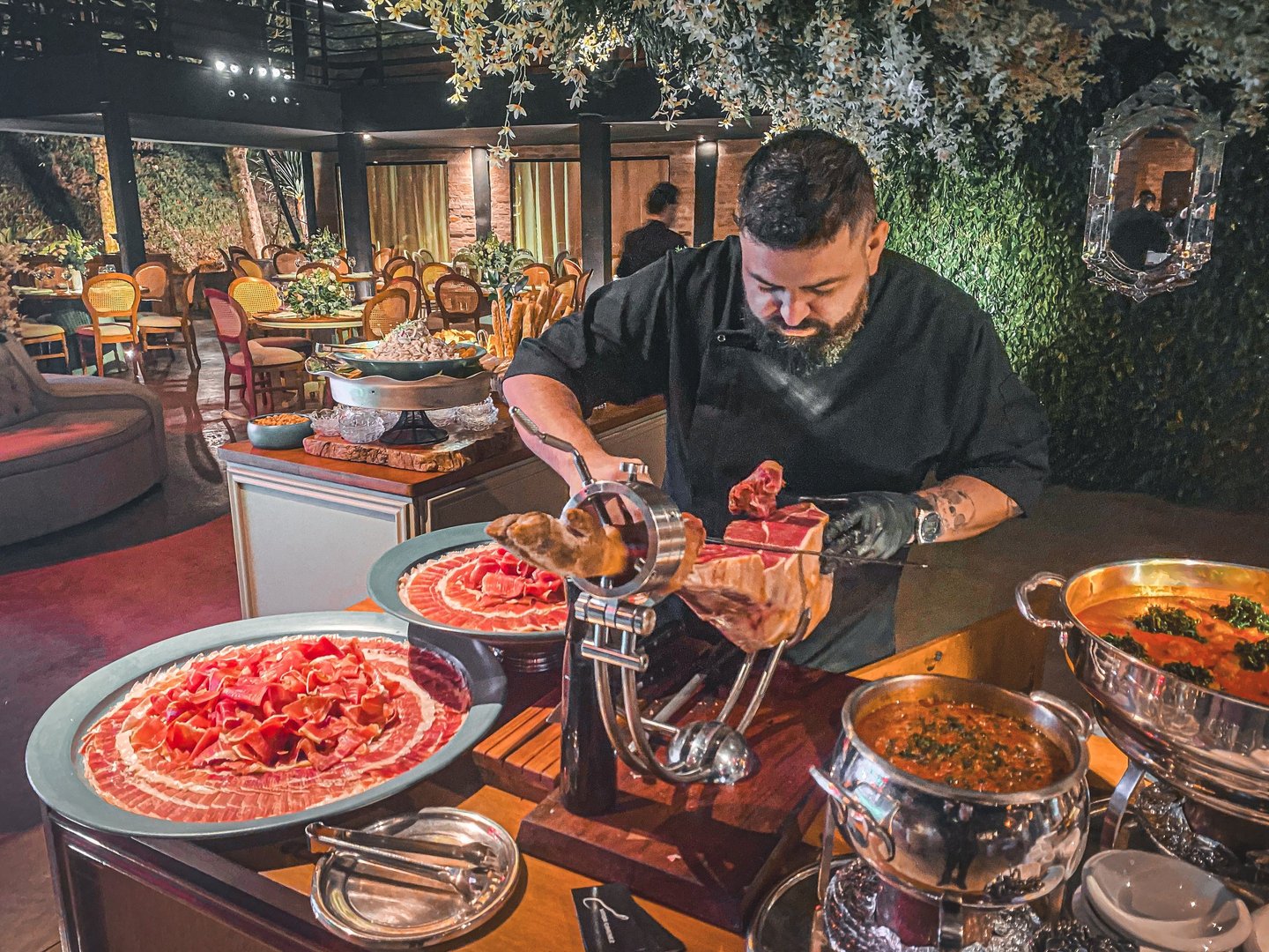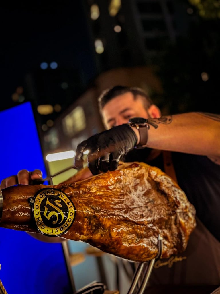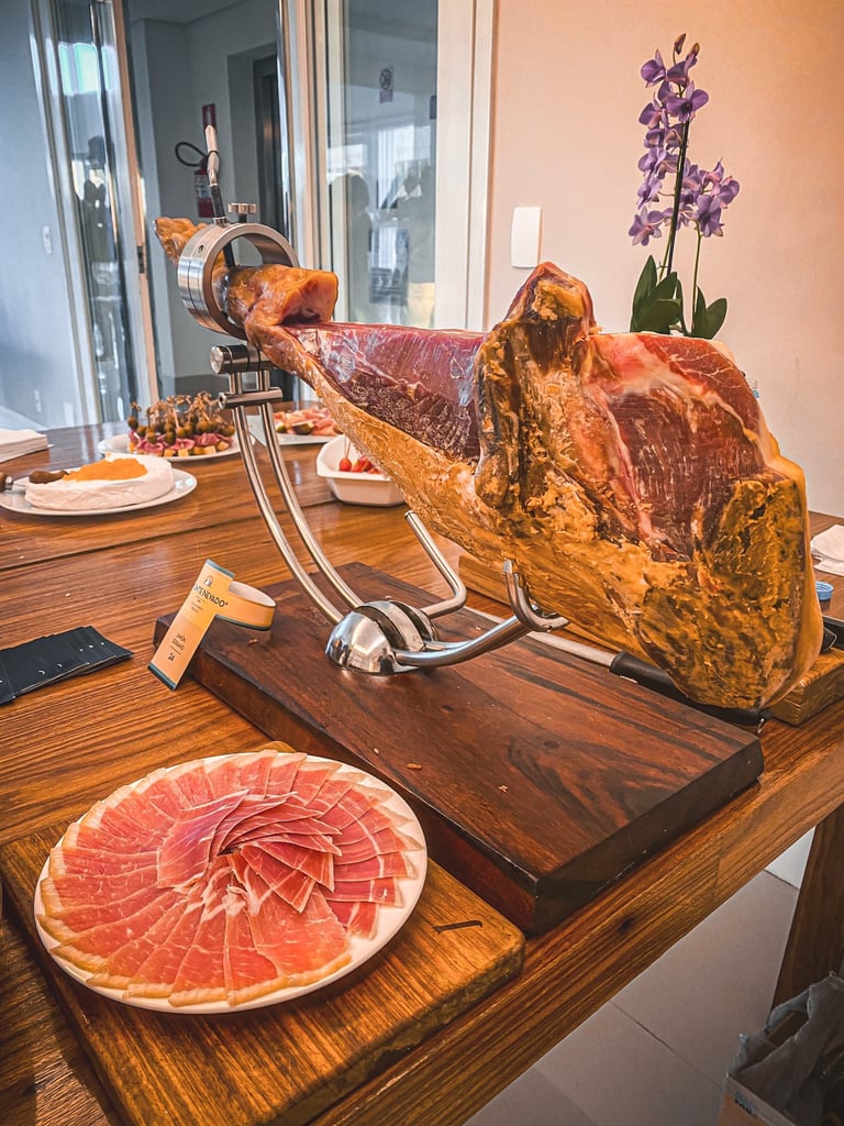 Experiência rica com jamón ibérico de bellota, a joia gastronômica.