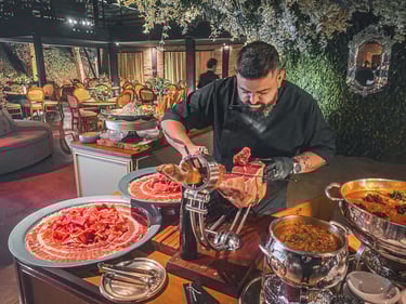 Com anos de dedicação, Vitor Gimenez domina a arte do corte de jamón, trazendo tradição e elegância para cada evento.